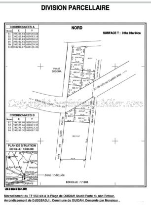 Il est mis en vente un domaine de 12 parcelles déjà loties et recasées d'une superficie de 400M² chacune issues du morcellement d'un domaine Titre Foncier situées au bord du goudron à côté de L'Hôtel Djègba dans l'arrondissement de Djègbadji à quelques 200M du Village Artisanal et à 300M de la Porte du non Retour à Ouidah Plage.